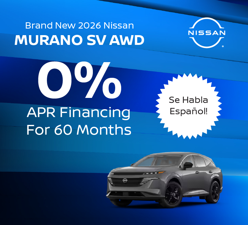 Plus tax, title, license and doc. fee. Offer available on all MY26 Murano trims. All offers with approved credit. 0% APR financing for 60 months on select new models with $0 down payment required. Terms may vary by model and trim. $16.67 per $1,000 financed. Must finance with NMAC. All offers expire 5/4/26.