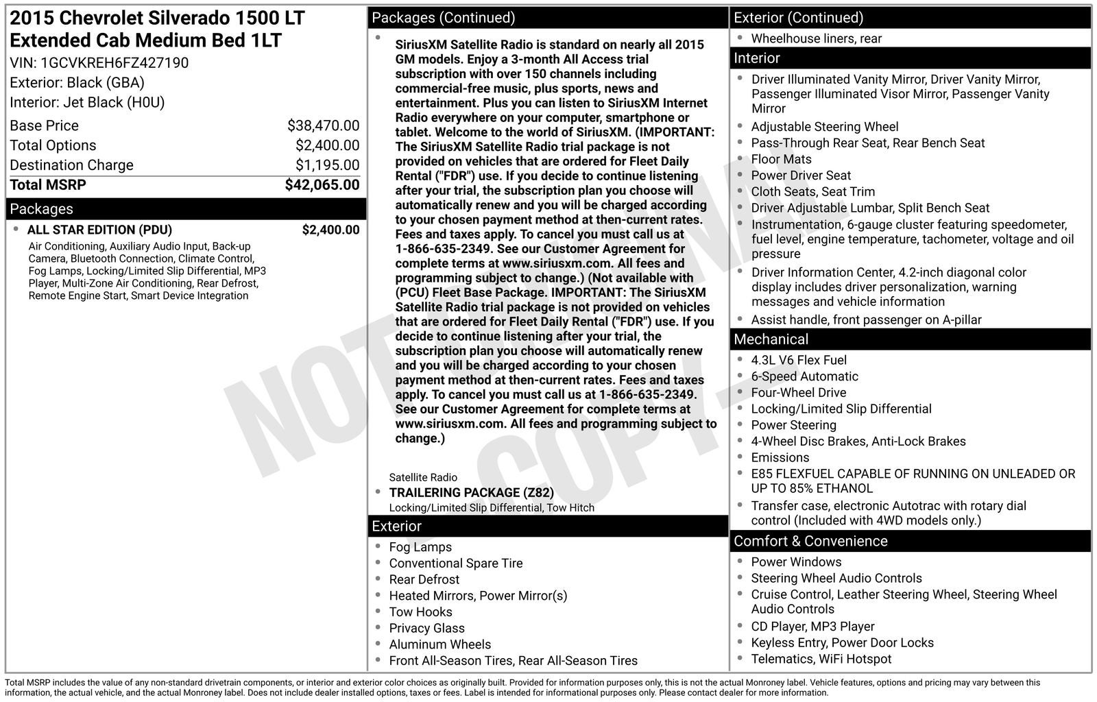 - SiriusXM Satellite Radio is standard on nearly all 2015 GM models. Enjoy a 3-month All Access trial subscription with over 150 channels including commercial-free music, plus sports, news and entertainment. Plus you can listen to SiriusXM Internet Radio everywhere on your computer, smartphone or tablet. Welcome to the world of SiriusXM. (IMPORTANT: The SiriusXM Satellite Radio trial package is not provided on vehicles that are ordered for Fleet Daily Rental ("FDR") use. If you decide to continue listening after your trial, the subscription plan you choose will automatically renew and you will be charged according to your chosen payment method at then-current rates. Fees and taxes apply. To cancel you must call us at 1-866-635-2349. See our Customer Agreement for complete terms at www.siriusxm.com. All fees and programming subject to change.) (Not available with (PCU) Fleet Base Package. IMPORTANT: The SiriusXM Satellite Radio trial package is not provided on vehicles that are ordered for Fleet Daily Rental ("FDR") use. If you decide to continue listening after your trial, the subscription plan you choose will automatically renew and you will be charged according to your chosen payment method at then-current rates. Fees and taxes apply. To cancel you must call us at 1-866-635-2349. See our Customer Agreement for complete terms at www.siriusxm.com. All fees and programming subject to change.)