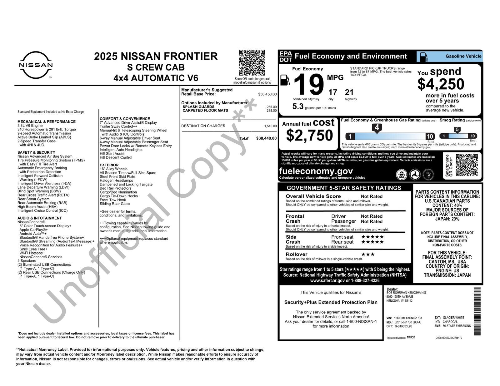 Under the hood, the 3.8L DI DOHC 24V V6 engine delivers a potent blend of power and efficiency, paired with a 9-Speed Automatic transmission and 4WD capabilities. With an EPA-estimated 18 MPG in the city and 23 MPG on the highway, this Frontier S is a gas-sipping workhorse that won't break the bank at the pump.